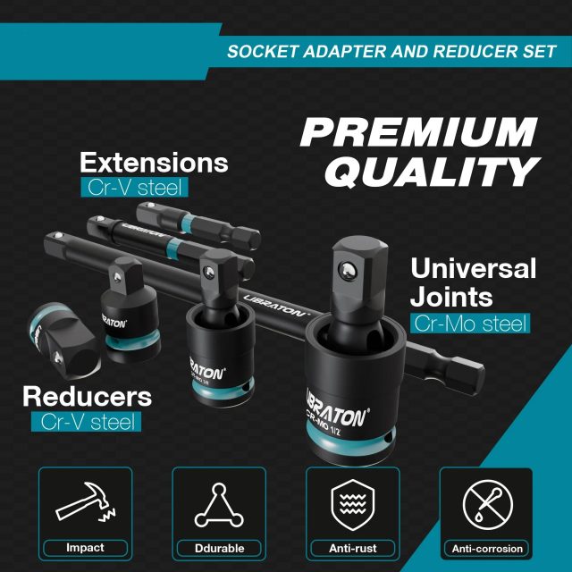 Each piece is crafted from Chrome-Vanadium (Cr-V) and Chrome-Molybdenum (Cr-Mo) steel, known for their exceptional durability and toughness. The black phosphate coating protects against rust and corrosion, ensuring long service life even under heavy-duty use. With precision chamfered edges and a spring-loaded detent ball, every adapter ensures a secure, slip-free fit for confident performance with hand or power tools.