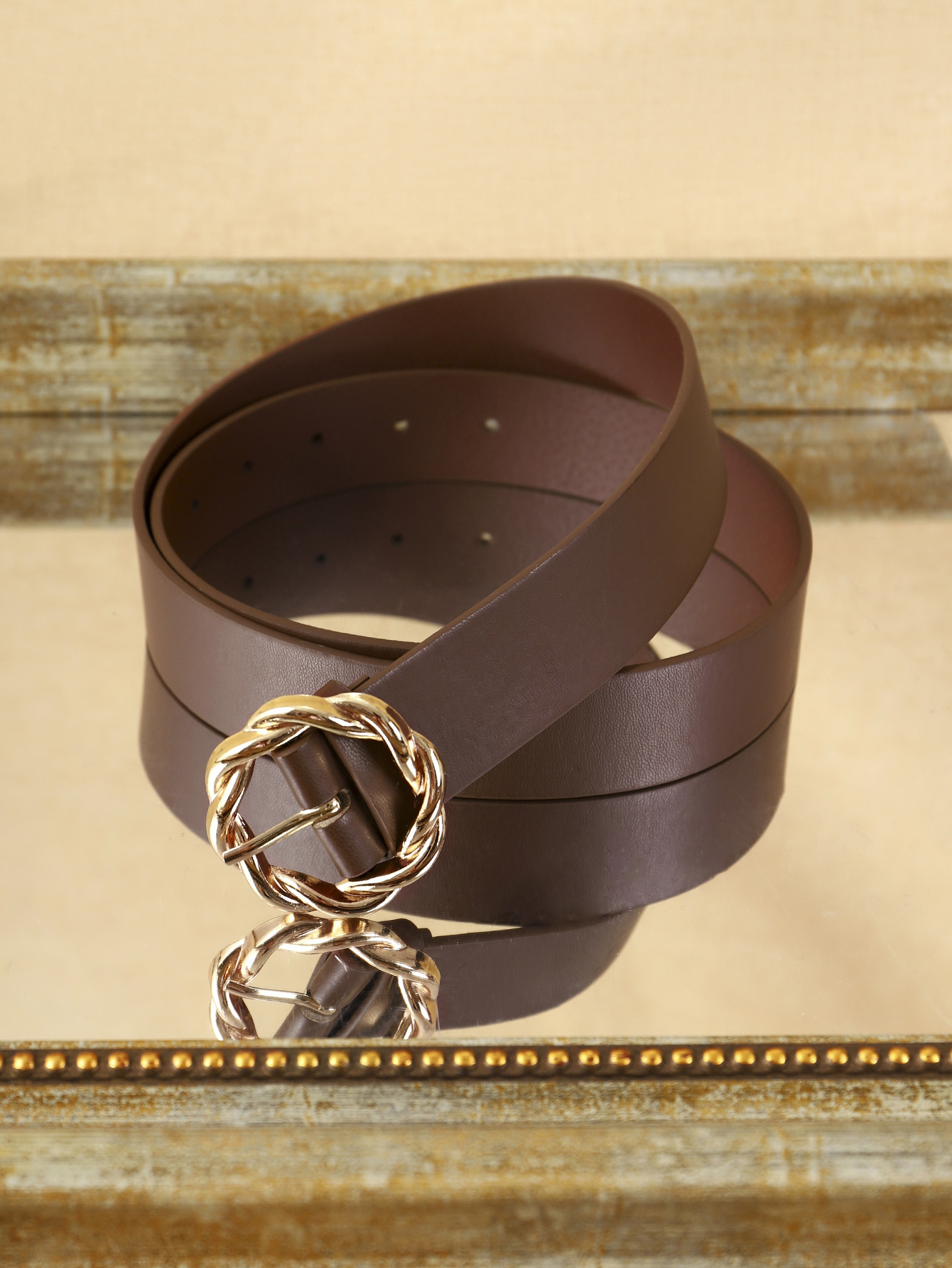 Women’s Coffee-Colored PU Belt with Gold Braided Buckle – Chic Everyday Accessory