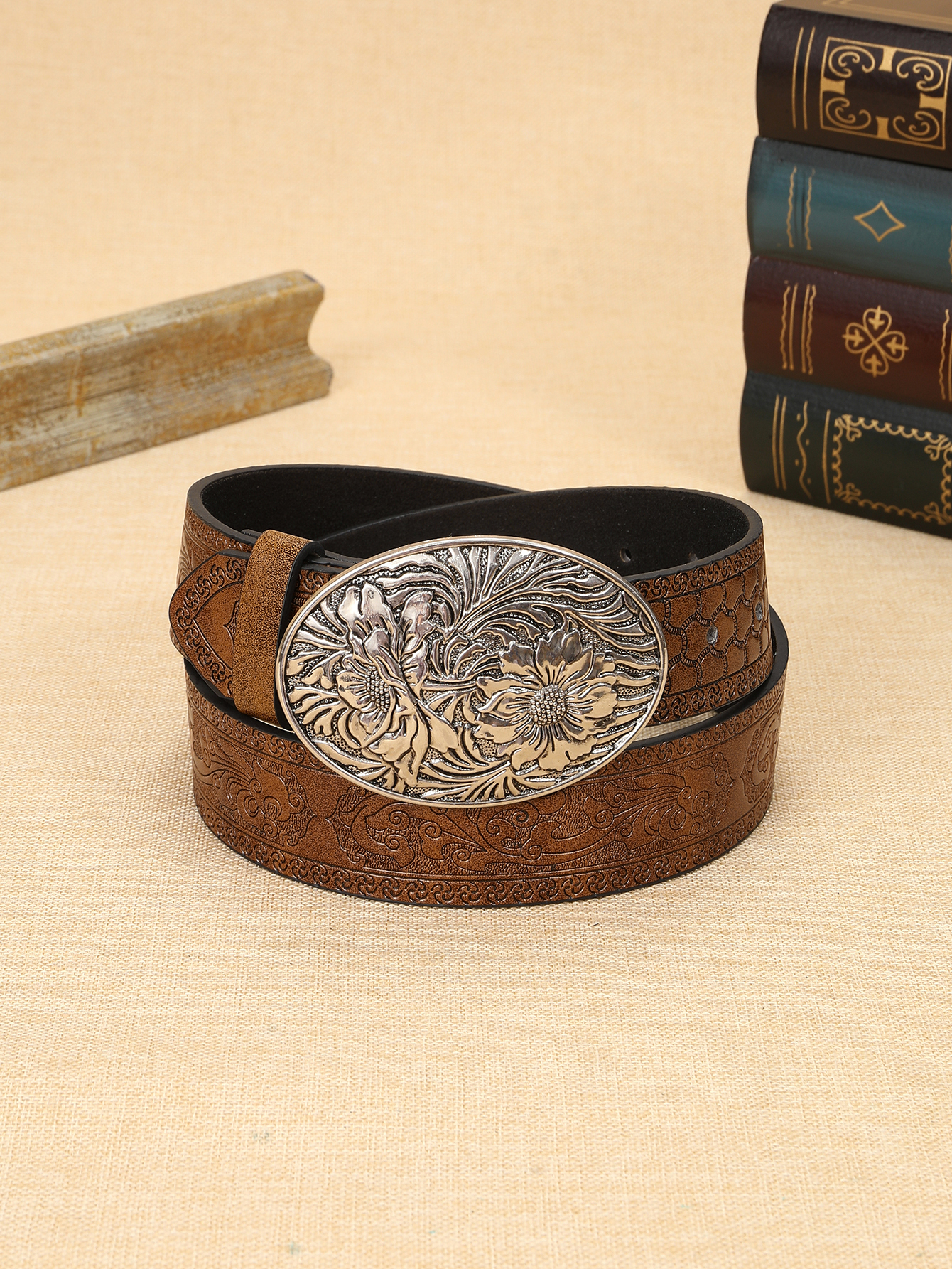 Its oval-shaped silver buckle steals the spotlight with an exquisite floral embossed design. This striking metallic accent captures the essence of western craftsmanship, making it a true statement piece that transforms even the simplest outfit into something extraordinary.