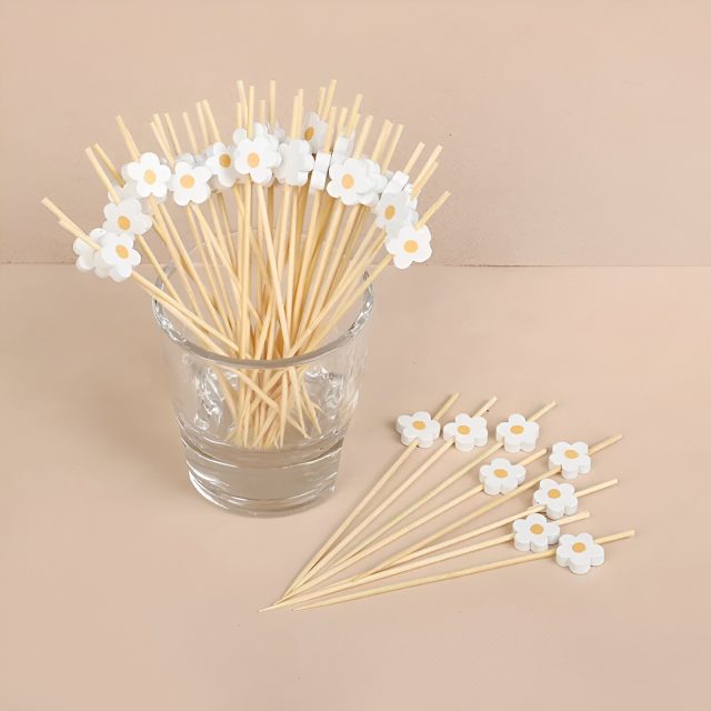 These bamboo daisy picks are a must-have for birthday parties, weddings, baby showers, picnics, tea parties, and festive gatherings. They’re ideal for serving fruits, desserts, cupcakes, cheese cubes, or cocktail garnishes. Simply place them on your platter, and watch how quickly they elevate your presentation with a touch of floral charm.