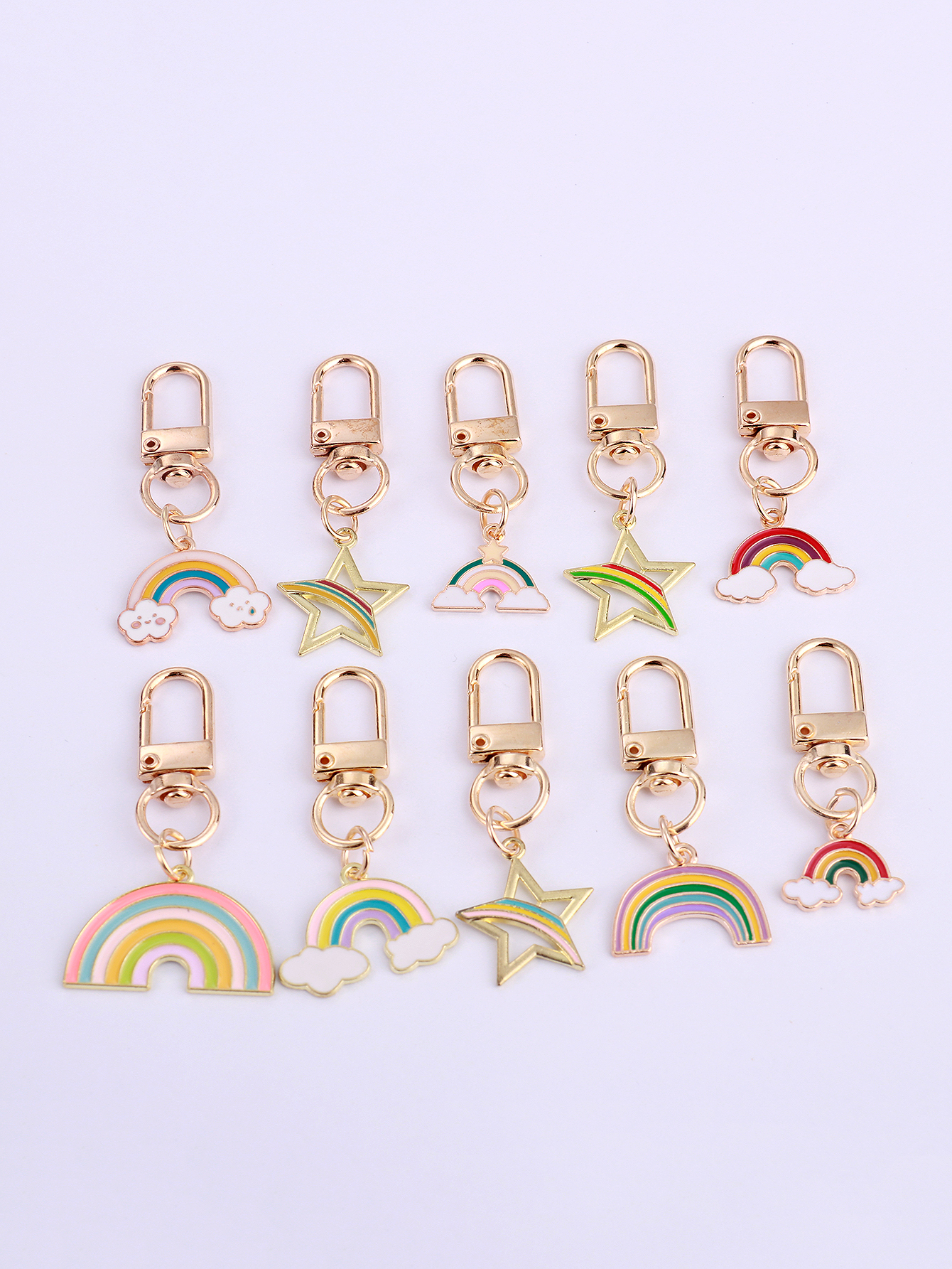Bring a touch of color and sparkle to your everyday essentials with the 10pcs Rainbow Star Keychain Set. Designed for those who love to express their personality, these vibrant star-shaped metal keychains are the perfect blend of fashion and fun. Whether clipped onto your purse, backpack, or keys, they add a cheerful charm that never goes unnoticed. Each keychain features a classic split ring for easy attachment, made from durable zinc alloy with a sleek gold-color finish that enhances its stylish appeal.