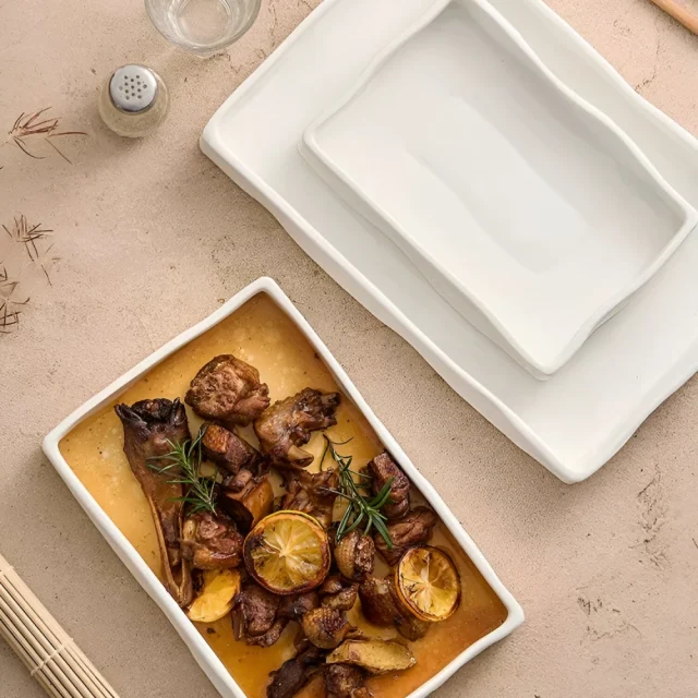Add a touch of sophistication to your table and make every meal feel special. This white ceramic rectangular dinner plate combines beauty, practicality, and lasting quality—making it a must-have for your kitchen collection. Serve your best dishes in style and impress every guest—order yours today!