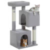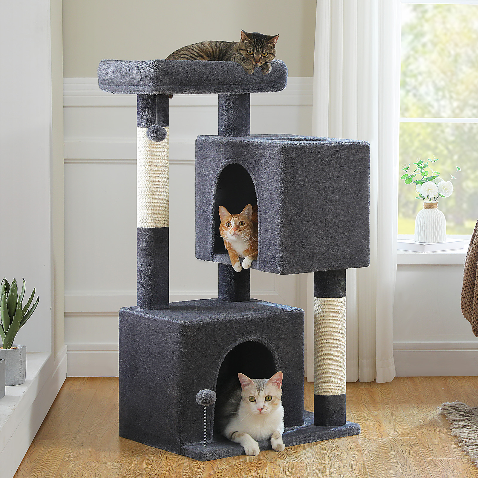 Crafted from premium wood and covered in ultra-soft plush, this cat tree gives your pets a safe and inviting environment to explore. The natural sisal scratching posts help protect your furniture, while the included interactive hanging ball keeps curious cats active and stimulated. Wide platforms and walkways allow large breeds and multiple cats to move without crowding. Its solid construction and thick support posts provide reliable stability, giving pet parents peace of mind.