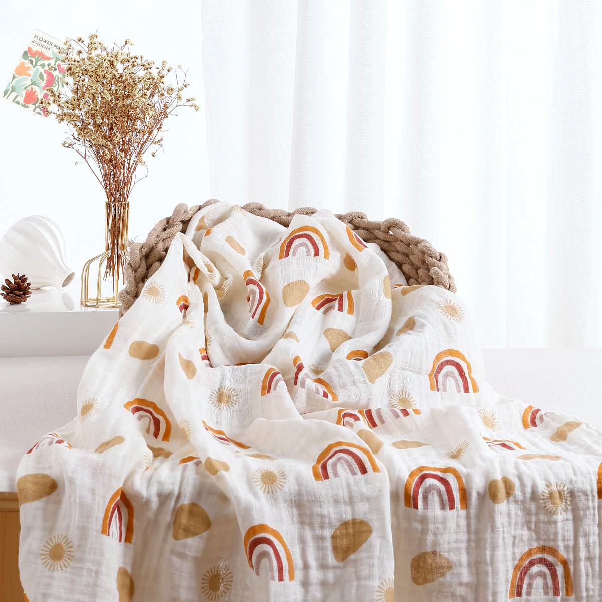 This muslin baby blanket is more than just a wrap. It’s a comforting companion for naps, a soft surface for playtime, and a cozy layer for outdoor strolls. Its lightweight feel and breathable fabric make it ideal for use in every season, while the beautiful print adds a sweet, modern look.