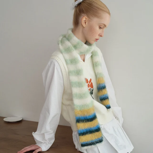 Crafted from a premium blend of wool, polyester, nylon, and spandex, this scarf combines warmth, softness, and a slight stretch for easy styling. The knitted construction ensures durability while providing a lightweight yet snug feel. Its striped design adds a touch of retro Y2K charm, making it a versatile piece that complements both casual and chic outfits.