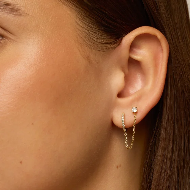 Make a statement of effortless elegance with these stunning 14K Gold Plated Double Piercing Chain Earrings. Designed for women who love refined sparkle and modern sophistication, this piece features a brilliant cubic zirconia huggie hoop connected to a delicate stud earring with a sleek gold chain. Perfect for those with two or more piercings, this earring elevates any outfit with a subtle yet luxurious glow.