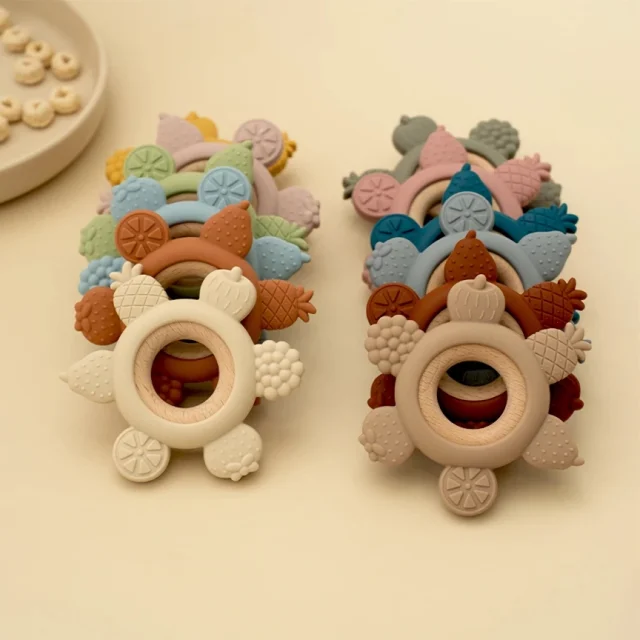 Help your baby experience happier teething days. Add this adorable silicone and wooden fruit teether to your cart and give their gums the gentle relief they deserve.