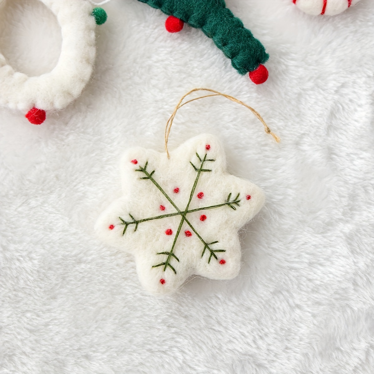 This ornament is made from high-quality felt with a wool-like texture, giving it a soft and cozy look without any stiffness. It hangs easily from branches, hooks, doors, or wall décor using its built-in hanging loop. With no electronics or batteries needed, it’s a low-maintenance decoration that brings charm without the hassle. The design blends a mini snowflake and a heart shape with bright red berry details for a festive, winter-inspired finish.