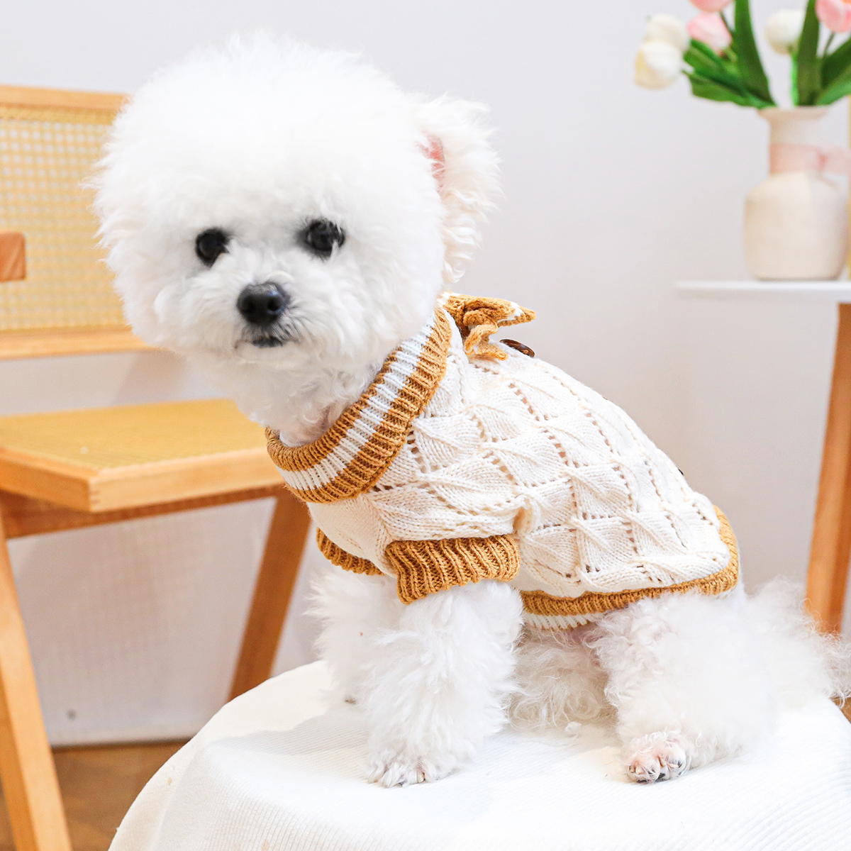 Give your pet the perfect blend of warmth and style with this cozy knit sweater. Designed in a classic hollow-knit pattern with a soft wool material, this pullover is as practical as it is adorable. The autumn-inspired brown tone is complemented by a delicate white bow, making it the ideal outfit for your dog or cat when the weather turns crisp. Whether it’s for a walk in the park, a family gathering, or a casual day at home, your pet will look and feel wonderful in this stretch pullover.