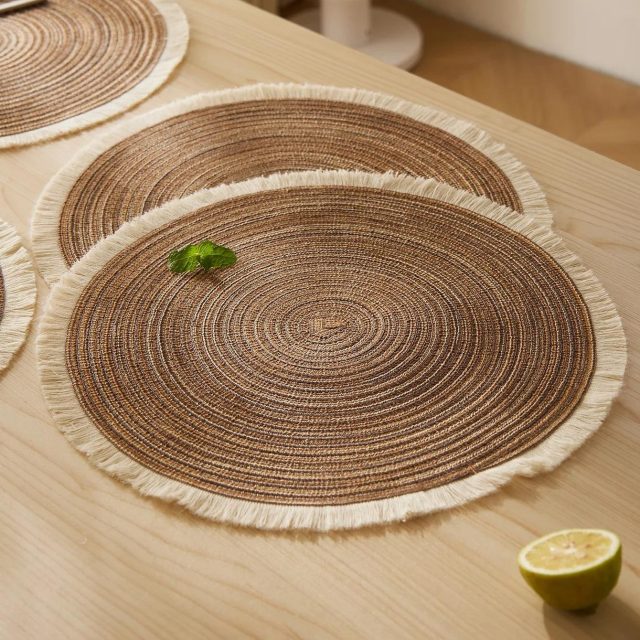 These round fringe placemats aren’t just beautiful—they’re built for everyday convenience. The textured, non-slip surface keeps plates and glasses steady, while the heat-resistant material safeguards your tabletop from damage. Their washable and reusable design makes them an eco-conscious choice, helping reduce waste without sacrificing elegance. The modern woven texture adds a stylish flair that complements any tableware, from rustic farmhouse to chic minimalist styles.