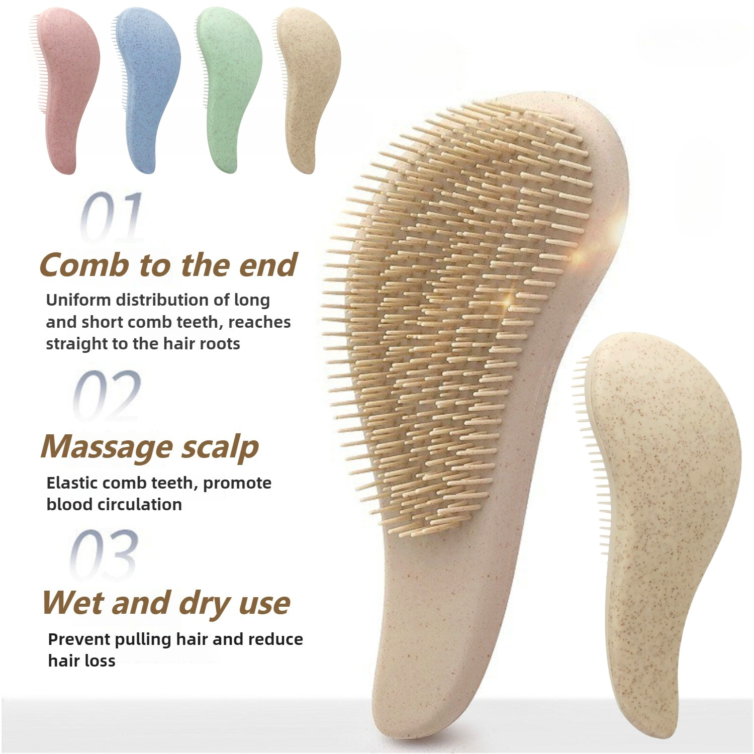 Meet your new everyday hair essential — a gentle, eco-friendly detangling brush designed to glide through knots with ease. Made from a blend of soft ABS wheat straw material and flexible TPEE bristles, this brush works beautifully on wet or dry hair while offering a soothing scalp massage. Measuring approximately 7.3 × 3.1 × 1.2 inches, it fits comfortably in your hand and makes daily grooming quicker, easier, and a lot more enjoyable.