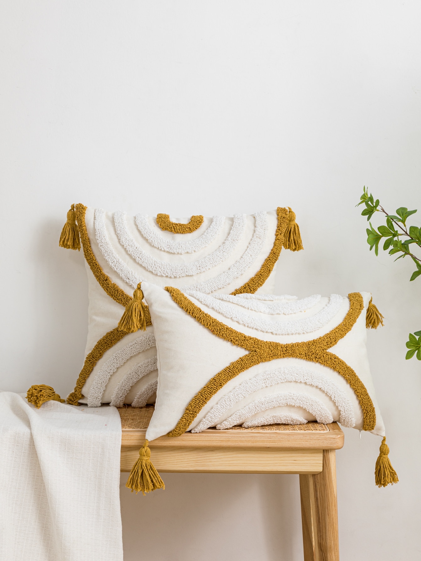 Refresh your home with this beautifully designed yellow geometric arc pillow cover that instantly adds warmth, personality, and a relaxed bohemian vibe to any room. With its eye-catching arc pattern and soft, inviting texture, this pillow cover is an easy way to update your décor without changing your entire setup. The cheerful yellow tone brightens your space while still feeling calm and cozy, making it perfect for everyday living.
