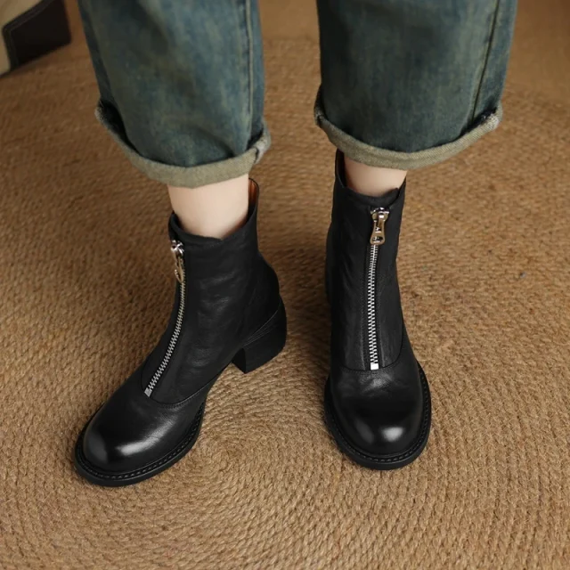 Crafted from 100% genuine leather, these ankle boots offer lasting durability and a premium feel. The front zipper adds a sleek design element while making them easy to slip on and off. Their retro style and minimalist silhouette make them a versatile staple for any wardrobe.