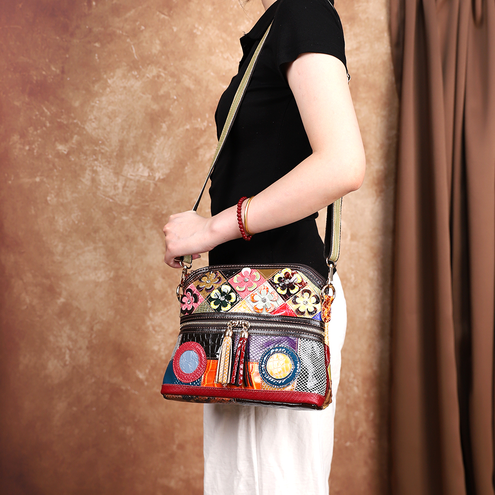 The combination of soft genuine leather and floral appliqué decoration makes this bag a standout accessory. Its smooth texture, rich color, and compact size ensure that it remains stylish yet practical. The zipper closure keeps your belongings safe while adding to the overall sleek design of the bag. With a single shoulder strap that’s both comfortable and adjustable, this bag offers a personalized fit, whether worn as a shoulder or crossbody bag.