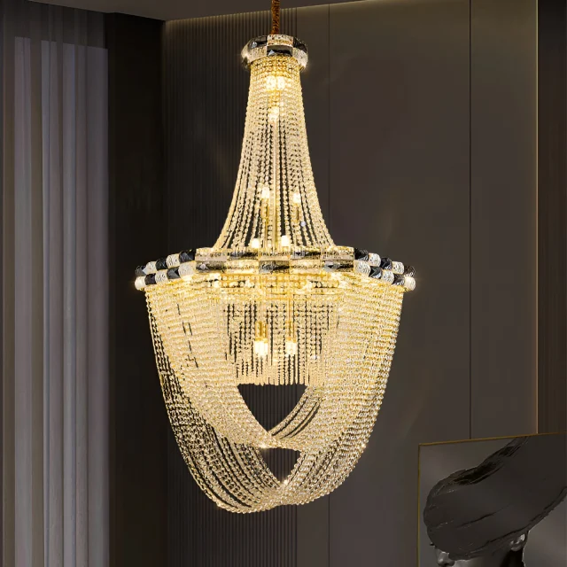 Every detail of this chandelier is made to capture attention. The combination of premium crystal elements and a durable plated iron frame ensures both beauty and strength. Fitted with over 20 LED light sources, it provides brilliant illumination that covers an area of 160–320 sq ft, making it ideal for grand open spaces. The warm, golden glow reflects beautifully through the crystal layers, turning every evening into a luxurious experience.