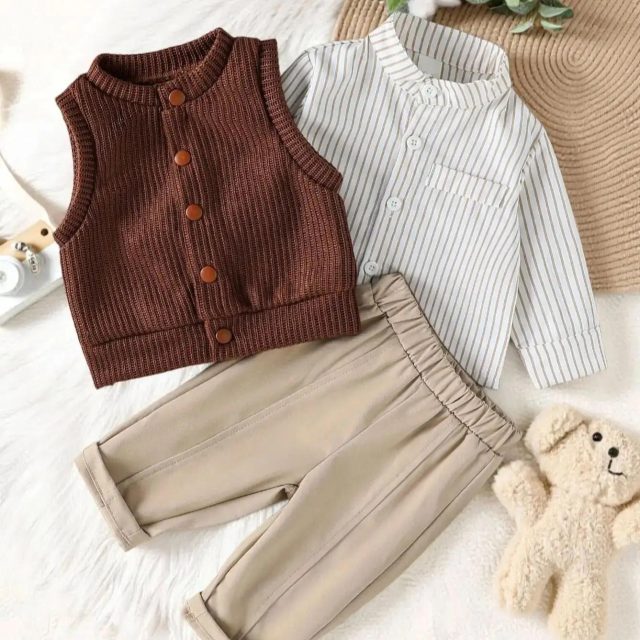 Bring charm and comfort together with this adorable 3-piece baby boys’ casual outfit. Designed for ages 1 to 3 years, this stylish set includes a striped long-sleeve shirt, a soft vest, and solid-colored pants that make dressing up your little one both easy and fun. Whether it’s for a family gathering, a birthday, or simply a stroll in the park, this outfit ensures your baby boy looks smart and feels cozy all day long.
