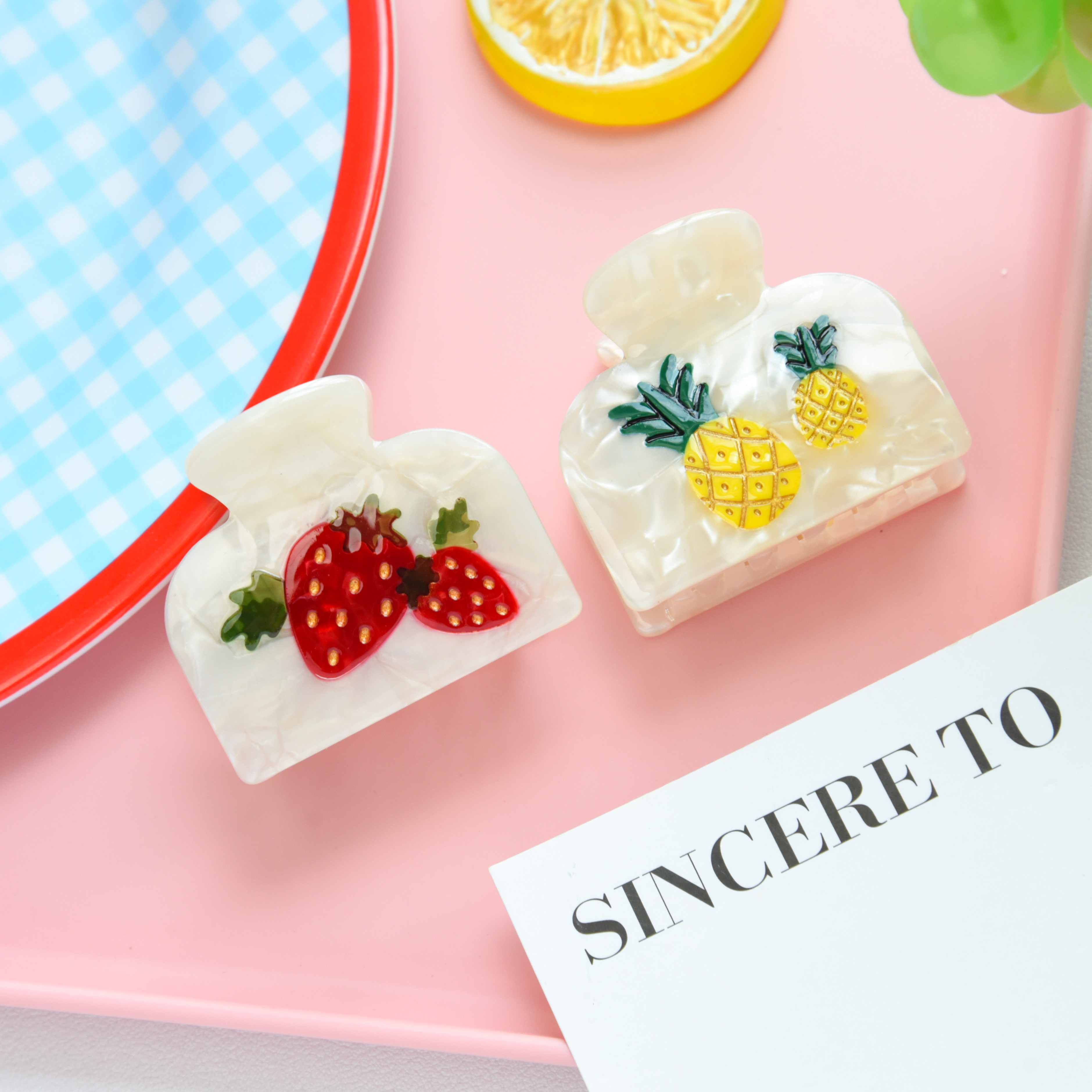 Crafted from high-quality acetate, this hair claw feels smooth, sturdy, and comfortable in your hair. It holds securely without pulling or snagging, making it perfect for all-day wear. The modern shape and glossy finish give it a fashionable edge, while the fruit design adds a lighthearted touch that never goes out of style. Measuring approximately 2.2 x 1.7 inches, it’s the ideal size for quick updos, half-up styles, or loose twists.