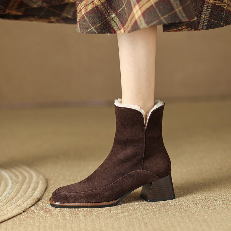 What makes these boots special is the thoughtful combination of high-quality materials and handcrafted detail. The soft suede upper feels rich and refined, while the rubber outsole provides reliable grip for everyday surfaces. A sturdy square heel adds subtle height without compromising stability, giving you confidence with every step.