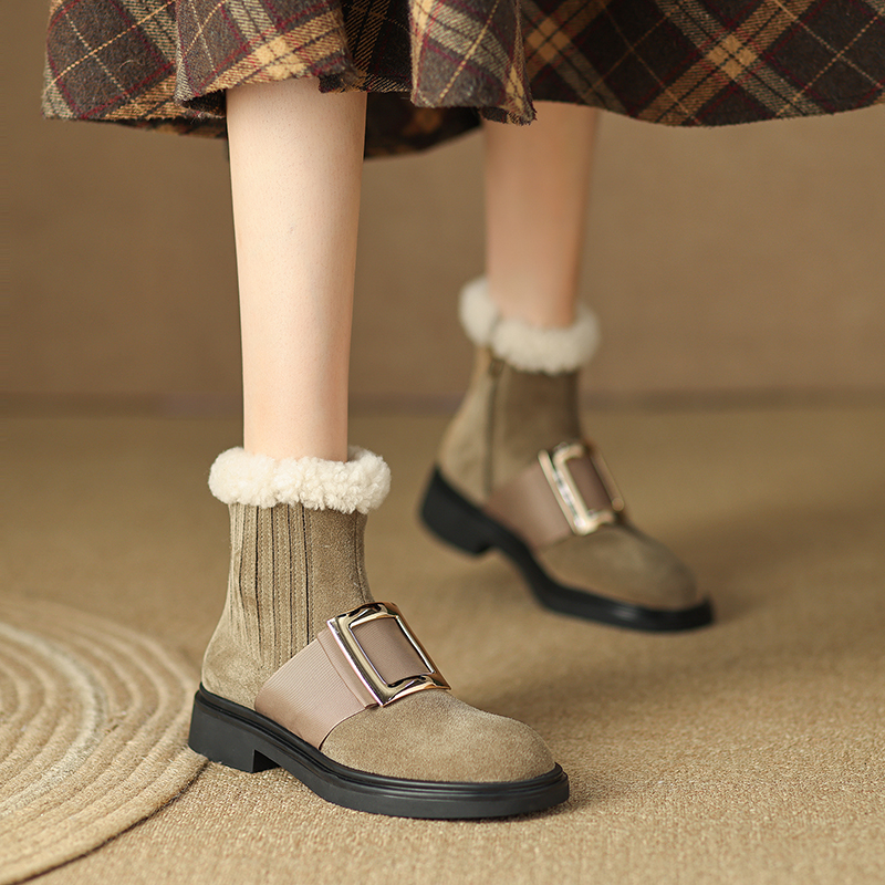Step into winter with confidence and warmth. These women’s suede wool snow ankle boots are designed to keep your feet comfortable while elevating your cold-weather outfits. Crafted with a soft suede exterior and a plush wool lining, they wrap your feet in gentle warmth without feeling bulky. The clean silhouette and subtle buckle detail add a refined touch, making them easy to dress up or down for everyday wear.