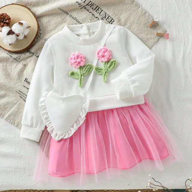 Made from a carefully blended fabric of polyester and elastane, this dress feels smooth, soft, and flexible against delicate skin. It’s lightweight yet warm enough for cold weather, making it ideal for daily wear, family outings, photos, and special moments. The matching bag adds a playful finishing touch, giving the outfit a complete and stylish look without any effort.