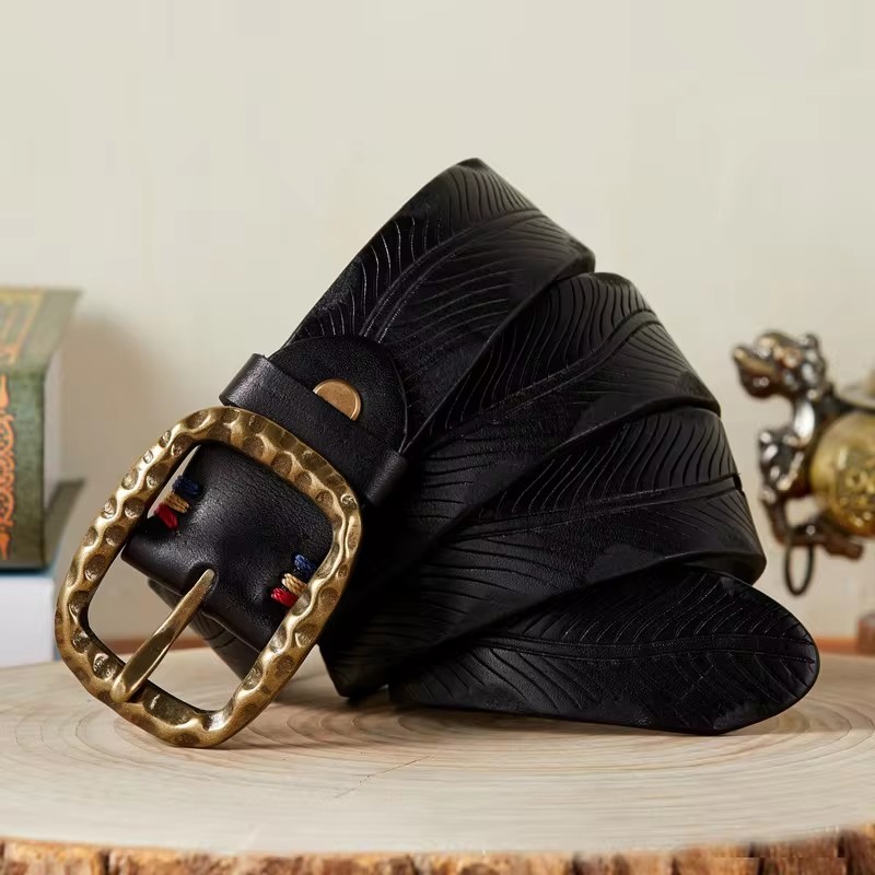 Thick Carved Genuine Leather Belt for Men – Vintage Copper Buckle Strap