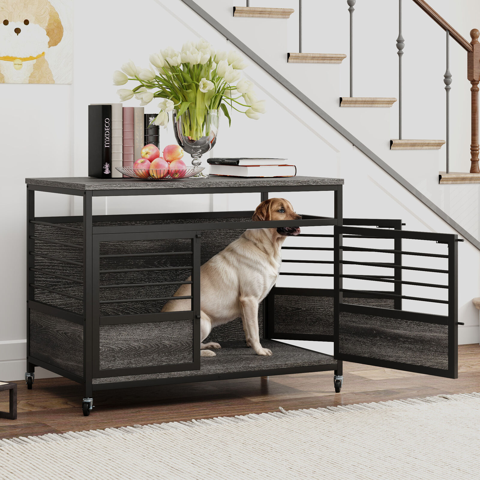 This dog kennel doesn’t just serve your pet — it enhances your home décor. The sleek dark grey finish and minimalist design make it a natural fit for modern interiors. A spacious tabletop provides room for décor, books, or pet essentials, and the dual-door design allows for easy access from the front and side. The secure latch lock ensures your dog’s safety, giving them a private retreat to rest and unwind.