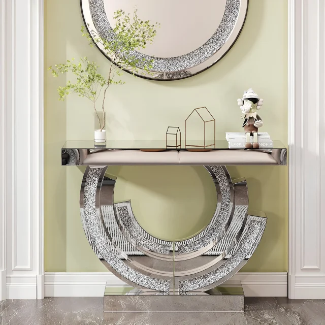 Handcrafted with precision, this console table features a curved 3C-shaped base and high-end silver mirrors that ensure clear, distortion-free reflections. Each small mirror is carefully hand-polished at an oblique angle to create depth and sparkle, while the inlaid acrylic diamonds shimmer brilliantly under any lighting. Built from durable MDF and glass, this table blends strength with elegance — a perfect fusion of beauty and stability.