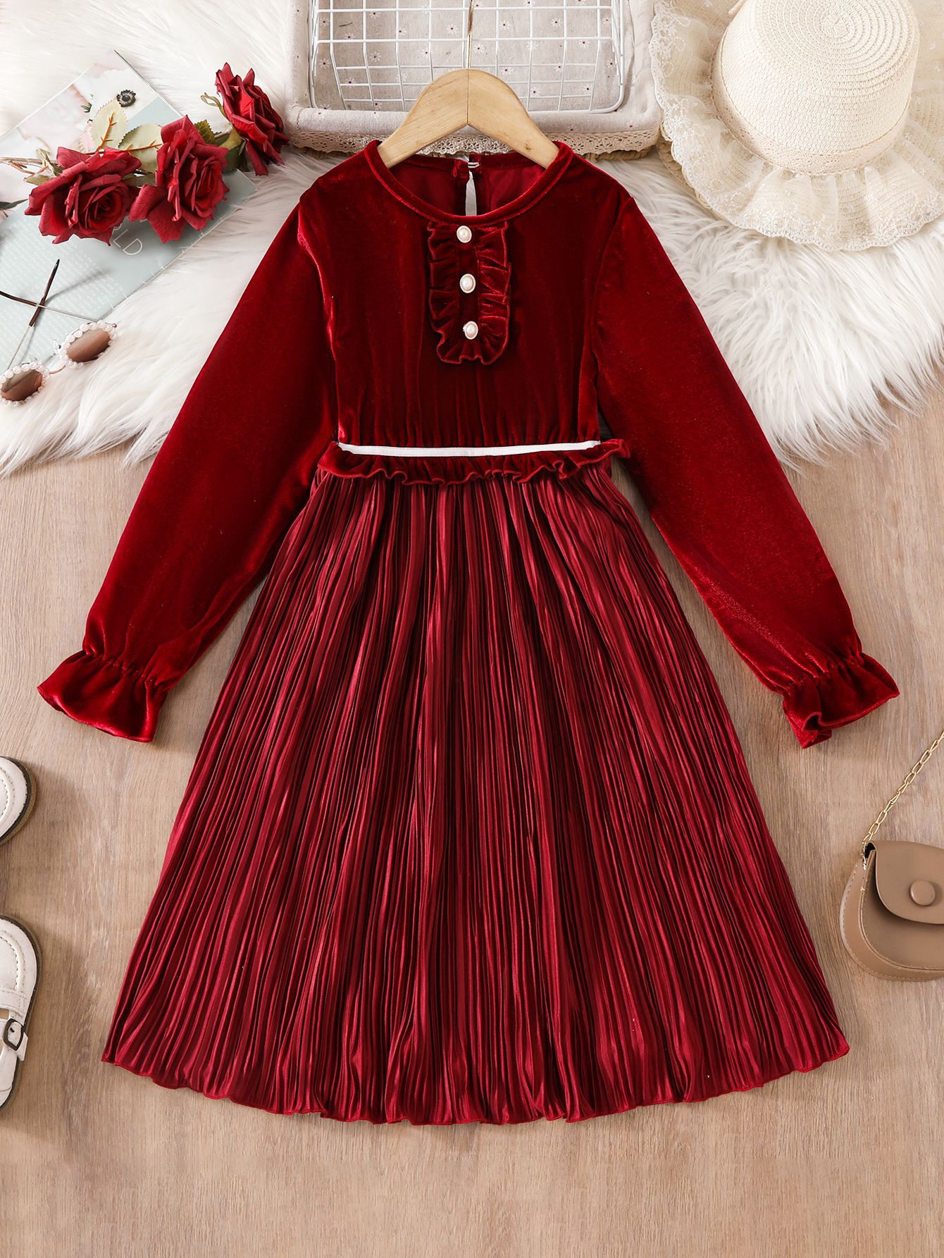 Made from premium velvet fabric, this long-sleeve dress feels smooth against the skin and keeps your girl warm on chilly days. The delicate pearl buttons and ruffled bodice add a touch of timeless elegance, while the pleated A-line skirt creates a graceful silhouette that’s perfect for twirling and dancing. Its O-neck design and mid-calf length make it easy to pair with cardigans, tights, or boots for a complete seasonal look.