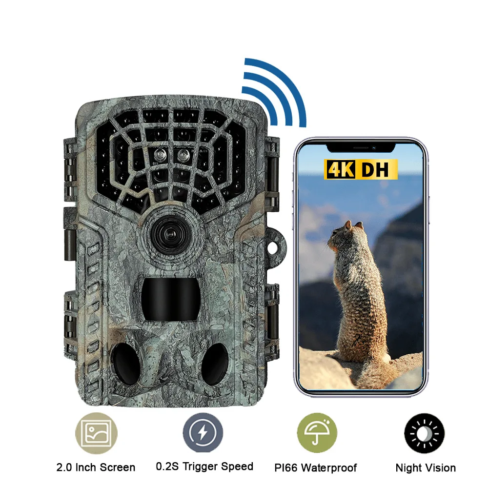 This trail camera combines technology and durability for seamless outdoor use. Built with WiFi and Bluetooth control up to 33ft, you can easily connect to your phone through a dedicated app for instant viewing and downloads. Its lightning-fast 0.2-second trigger speed and wide 120° sensing angle ensure you never miss a moment. Even in the harshest weather, the IP66 waterproof design keeps your camera safe and ready to perform.