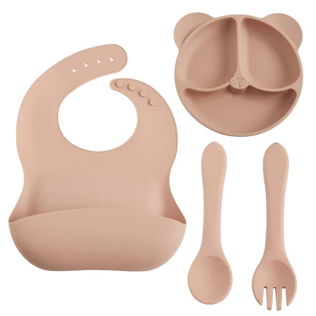 Introducing the ultimate feeding solution for your baby – a complete 4-piece silicone dinnerware set designed to make every meal safe, enjoyable, and mess-free. This adorable bear face divided plate set comes with a suction base, waterproof bib, spoon, and fork, making it perfect for toddlers learning to self-feed. Crafted from premium, baby-safe silicone, this set is gentle on your child’s mouth and easy on your hands.
