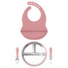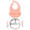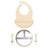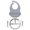 Made from food-grade stainless steel and soft, BPA-free silicone, each piece is gentle on delicate gums yet durable enough for everyday use. The materials are free from latex, PVC, phthalates, and nitrosamines – ensuring your baby’s safety at every bite. The non-slip silicone base keeps bowls and plates steady on highchairs or tables, while the detachable design makes cleaning simple and fast. Both the utensils and bib are designed with soft edges and flexible shapes for comfort and convenience.