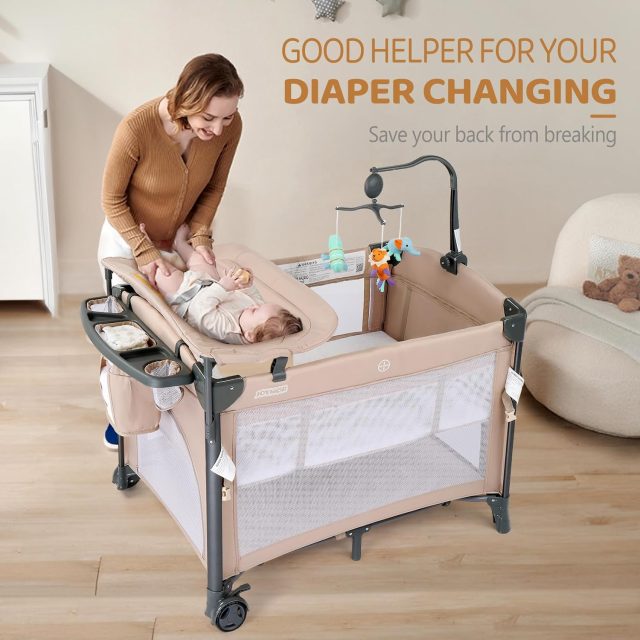 The secure bedside bassinet lets you keep your baby close during nighttime feedings, with a detachable sidebar for easy access and bonding. The sturdy changing table provides a comfortable height for diaper changes, helping parents avoid back strain. Equipped with two wheels and brakes, it moves smoothly from room to room yet stays stable when locked in place. The included soft mattress and washable sheet ensure a clean, snug, and restful sleep environment.