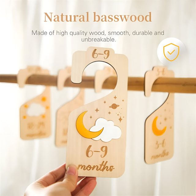 This set of wooden baby closet dividers is more than an organizer—it’s a celebration of parenthood and every tiny milestone along the way. Whether you’re preparing your baby’s nursery or searching for the perfect gift, these star-and-moon dividers bring both order and beauty to your space. Capture memories, keep your closet neat, and make every stage of your baby’s journey truly magical.