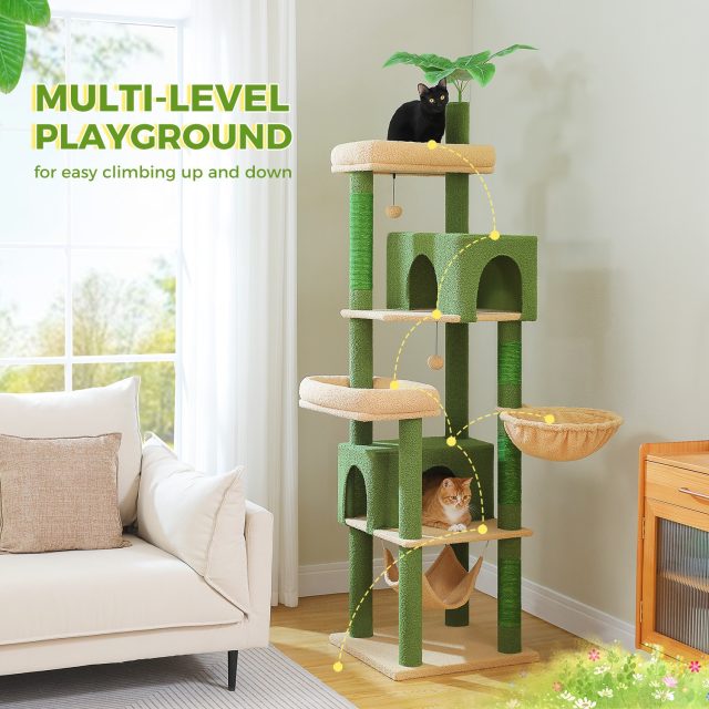 Built with safety in mind, the tall cat tree features a robust structure that supports large cats and playful kittens alike. Designed with stability in mind, the solid base ensures that your cats can jump, climb, and play without worrying about tipping over. This makes it the perfect choice for a multi-cat household.