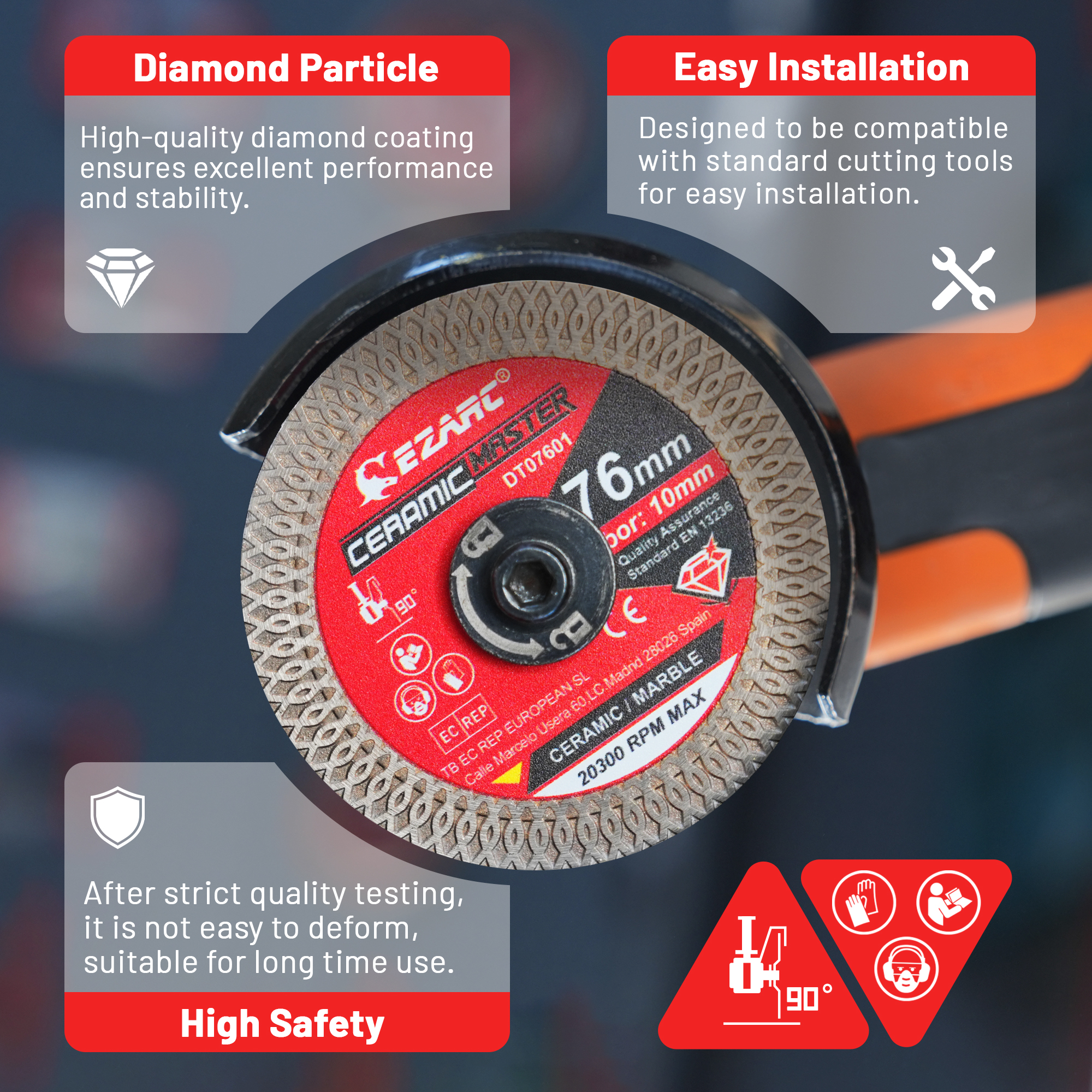 Upgrade your cutting experience with the 76mm Diamond Cutting Disc Set—the perfect blend of power, precision, and safety. Achieve professional-grade results effortlessly and bring your tile projects to life with confidence and precision.