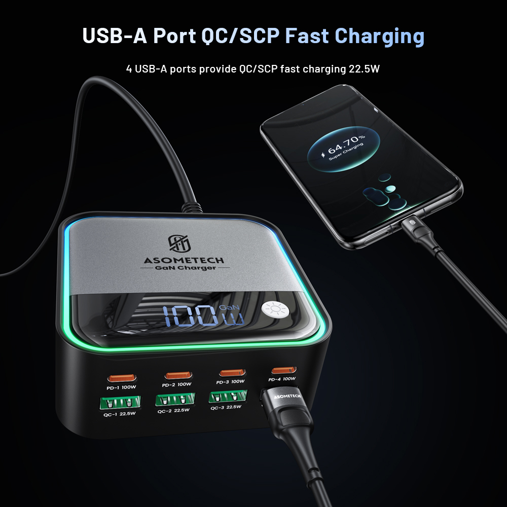 Meet the fast-charging solution your desk setup has been missing. This 100W GaN desktop charger is built to power your entire digital life from one compact hub. With 8 total ports and an intelligent digital display, it keeps your devices charged, organized, and ready whenever you need them. Whether you’re working, gaming, traveling, or relaxing at home, this charger eliminates cable chaos and slow charging once and for all.