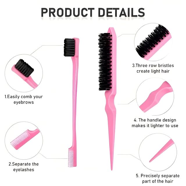 This versatile set includes everything you need for quick and beautiful styling: 4 topsy hair tail tools for effortless twists and loops, 1 bristle teasing brush for perfect volume, 1 edge control brush for sleek baby hairs, and 2 metal pin rat tail combs for precise parting and sectioning. Each tool is crafted for comfort and control, helping you create stunning hairstyles in just a few simple steps.