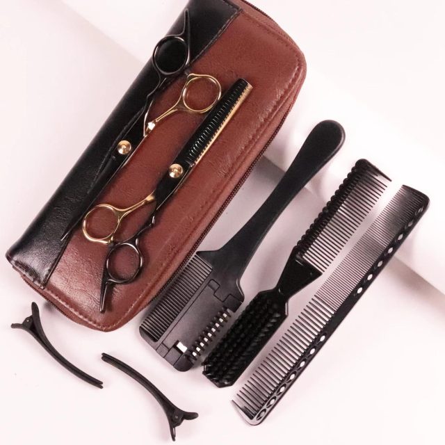 8pcs high-end barber haircut set with scissors,sparse hair comb,comb,brush,clip,leather bag Special for real hair wigs