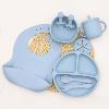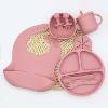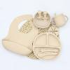 This all-in-one feeding kit includes a bib, dining plate with suction base, bowl with suction cup, 2-in-1 training cup for water or milk, snack cup, and a matching spoon and fork. Each piece is designed to make feeding time effortless while helping your baby develop self-feeding skills. The suction feature keeps dishes firmly in place—no more tipping or flying plates!