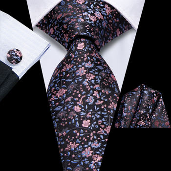 Men’s Silk Floral Tie Set with Hanky & Cufflinks – Pink Blue Black, 3.35″ Width