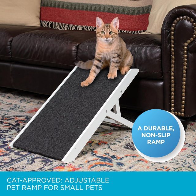 Designed with convenience in mind, the ramp adjusts to three height settings at 12″, 14″, and 16″, making it versatile for sofas, beds, and vehicles. When not in use, it folds down flat to just 2″ for compact storage and easy portability. Lightweight at only 10 lbs, it’s simple to carry, store, and move wherever your pet needs a boost.