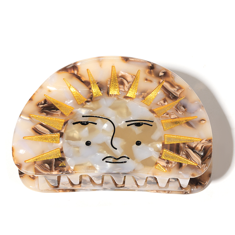 This hair clip is special because it transforms celestial inspiration into high-fashion elegance. The cosmic print pattern isn’t just a simple design—it’s a carefully composed arrangement of stars, moon, and sun elements that creates a harmonious balance between whimsy and sophistication. What makes it truly special is the quality acetate material that gives the clip a premium, slightly translucent quality, allowing light to play beautifully through the celestial patterns. The medium size makes it substantial enough to be noticed but versatile enough for daily wear. It’s this combination of poetic inspiration, quality materials, and trendy design that makes it exceptional.