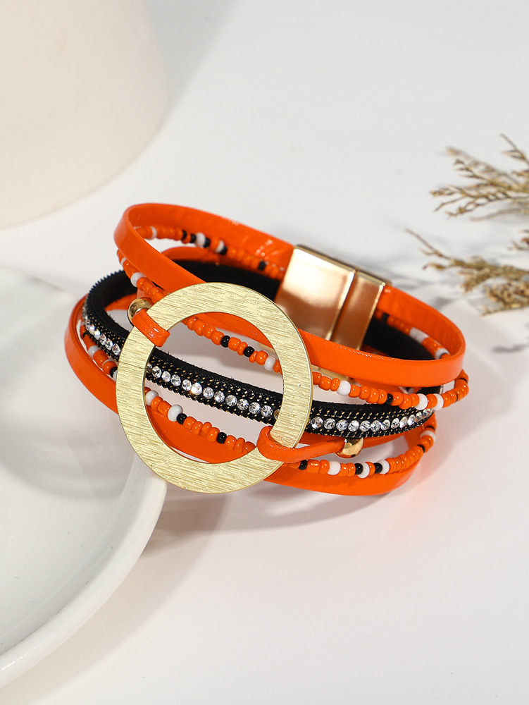 Crafted with care and creativity, this bracelet is made from premium PU leather and durable alloy. The design showcases multiple layers of braided leather, seed beads, and crystal chains, finished with a striking gold circle and leaf charm that catches the eye. Its bohemian-inspired look gives you an instant style boost, whether you’re dressing up or keeping it casual.