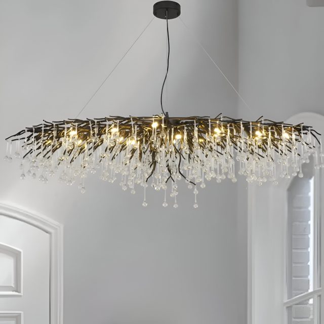 Expertly crafted from high-quality metal and crystal glass, this chandelier delivers both durability and luxury. Available in striking black, gold, and chrome finishes, it complements any interior style — from contemporary chic to timeless elegance. The oval or round pendant design offers a perfect focal point for any ceiling, while its adjustable dimmable lighting allows you to set the perfect mood for any occasion.