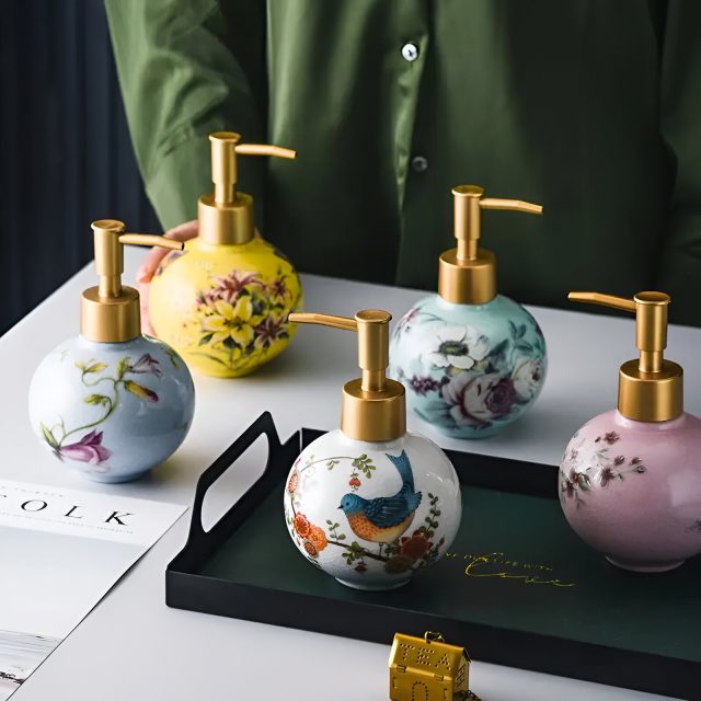Transform your daily routine into a touch of elegance with this American Painted Flower Ceramic Soap Dispenser. Crafted from high-quality ceramic and topped with a stunning gold press pump, this dispenser adds a luxurious accent to any bathroom, kitchen, or vanity space. Its smooth, hand-painted floral design creates a timeless charm that complements both classic and modern interiors alike. Whether you’re dispensing soap, lotion, or shampoo, this beautiful bottle blends functionality with artistry.