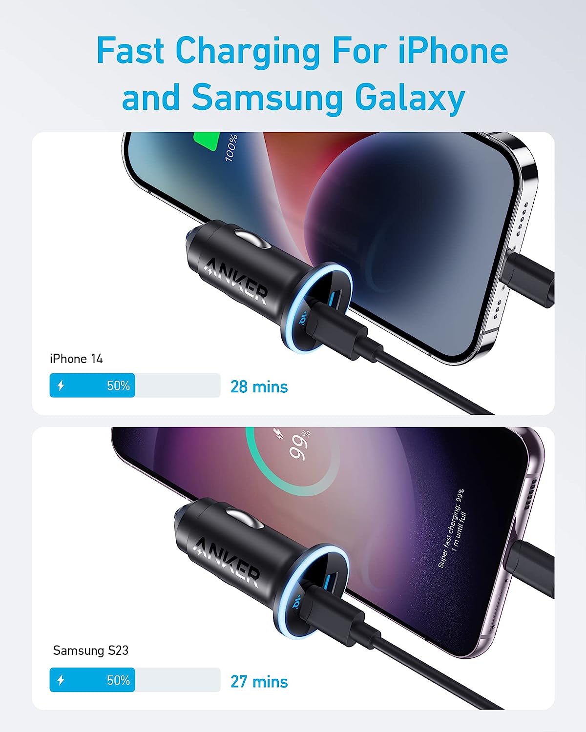 52.5W Fast Car Charger with USB-C and USB-A Ports – 30W PowerIQ 3.0, Dual Port Adapter