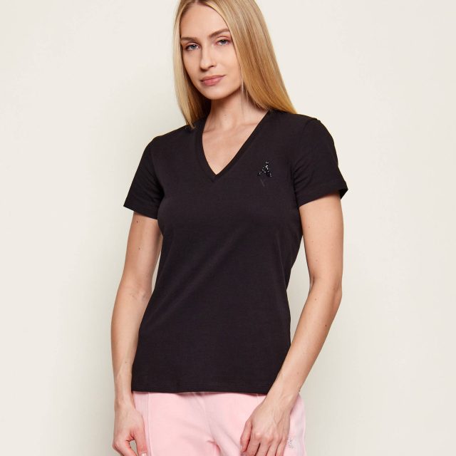 This t-shirt is more than just a basic wardrobe piece—it’s a staple that brings effortless elegance to your everyday look. The clean black color pairs beautifully with everything, from your favorite jeans to skirts, giving you endless outfit possibilities. The short sleeves and v-neck design create a flattering silhouette, making it a great choice for both relaxed and stylish occasions.