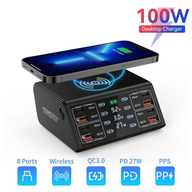 ASOMETECH 100W USB C Fast Charger Station,4 QC3.0 + 4 PD3.0 PPS + Wireless Charging,9 in 1 USB Charger For Samsung iPhone iPAD