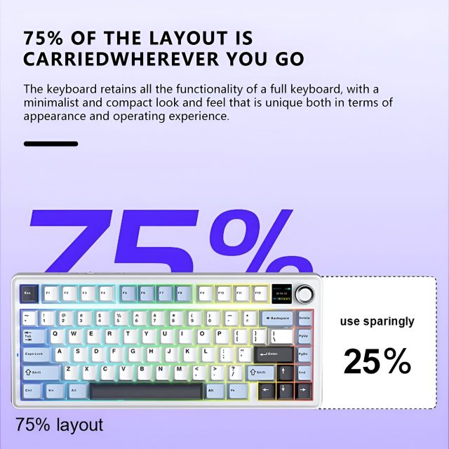 This 75% mechanical gaming keyboard is designed for players, creators, and professionals who want performance without clutter. Its compact layout saves desk space while keeping the keys you actually use within easy reach. The clean, modern look is paired with a soft, refined typing feel that makes every session more enjoyable, whether you are gaming late at night or working through the day.