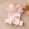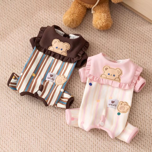 Crafted from soft, breathable polyester fiber, this jumpsuit features a unique striped pattern and a cute bear design on the belly. The button-down shirt style adds an extra touch of sophistication while ensuring easy wear for your pet. It’s available in two gorgeous colors: pink and coffee, making it easy to match your dog’s personality and look.